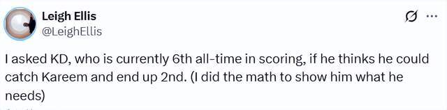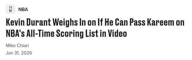 NBA记者埃利斯通过计算后告知杜兰特:要想超越贾巴尔,成为历史得分榜的第二,杜兰特需要在接下来出战的268场比赛中,保持场均25分的水准。 杜兰特坦言自己不确定能否做到这一点,同时表示,这未必是他会去刻意追逐的目标。 “我从不想把话说死,但那些前辈们把门槛设得太高了,”杜兰特说道,“看看历史得分榜前三名或者前四名的球员就知道,你至少得在联盟征战20个赛季,才能摸到那个门槛的边,而且还得在这15到20年里始终保持顶级水准。所以我更倾向于顺其自然——在联盟里打久一点,打上20多年,再看最终能走到哪一步。如果最后真的能跻身那个行列,自然是好事;就算不能,我也只想一直留在联盟里打球。” 记者还提到没去算詹姆斯得分,因为他觉得杜兰特应该追不上詹姆斯。杜兰特回应道:“没人能追得上他的纪录。”