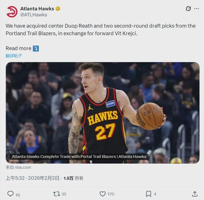 北京时间2月2日上午,亚特兰大老鹰官方宣布:球队将前锋克雷伊奇送到开拓者,1换3交易得到中锋杜普-里斯、2027年次轮签以及2030年次轮签。里斯接受右脚应力性骨折手术,已经赛季报销,老鹰相当于用克雷伊奇换了2个次轮。