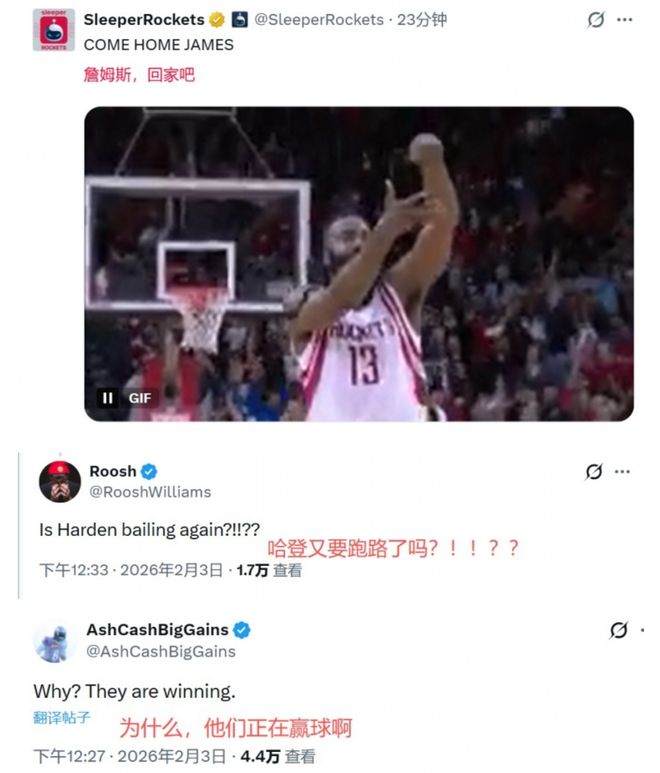 另外有网友说:“哈登一辈子拿不到总冠军戒指,他的旅程还在继续。”、“如果交易他,那不如把莱昂纳德也一起交易掉。”、“最近19场比赛,快船的战绩是16胜3负,他们难道不想打季后赛了吗?”、“快船的状态本来已经回来了,现在他们是联盟里势头最火热的球队,哈登居然想走,背后是不是发生了什么我们不知道的内幕?”可以看到大部分的网友其实还是不懂,为什么在这个时间点,哈登会和快船商量着走人。