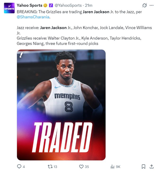 北京时间2月4日凌晨,根据ESPN记者Shams的报道,爵士队与灰熊队达成交易,小贾伦-杰克逊将被交易到爵士队换取三个首轮签。 这笔交易的细节是,爵士得到小贾伦-杰克逊、康查尔、兰代尔、文斯-威廉姆斯; 灰熊得到:小沃尔特-克莱顿、李凯尔、亨德里克斯、乔治-尼昂、三个首轮签。