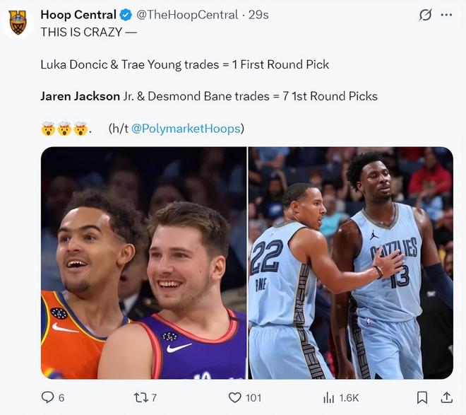 美媒Hoop Central写道:这太疯狂了,东契奇、特雷杨只换来一个首轮,而小贾伦+贝恩则换到了7个首轮签。