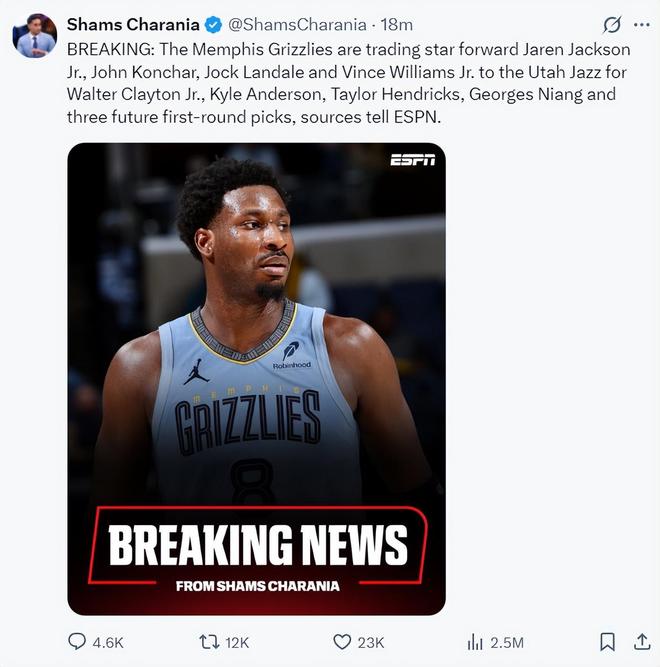 灰熊爵士涉及8人大交易!小贾伦换取3首轮签灰熊未来7年握13首轮