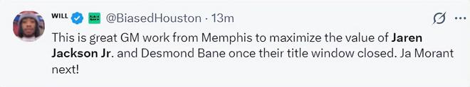 休媒发来赞誉:这是来自孟菲斯灰熊的一次出色运作,他们最大的限度的发挥了贝恩、小贾伦两人的交易价值,接下来肯定是莫兰特了。