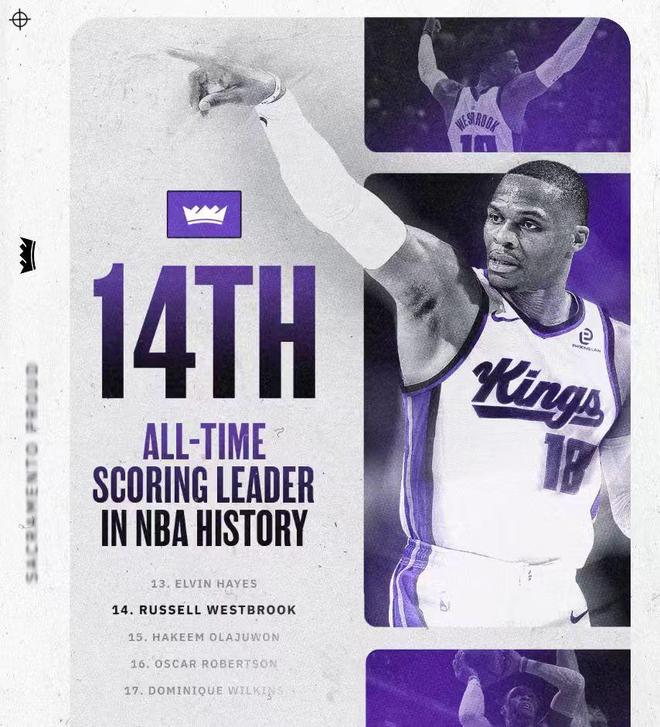 数据统计 国王:小萨博尼斯24分15板3助、德罗赞20分3板5助、克利福德14分3板5助、威斯布鲁克13分5助、蒙克13分4助、拉文11分、卡特10分6板5助。 灰熊:杰罗姆28分1板7助、斯潘塞20分3板5助、韦尔斯18分3板1助、GG·杰克逊16分7板2助、波普15分2板2助、阿尔达马12分6板2帽。 里程碑 威少常规赛总得分超越火箭名宿奥拉朱旺,升至NBA历史总得分榜第14位。