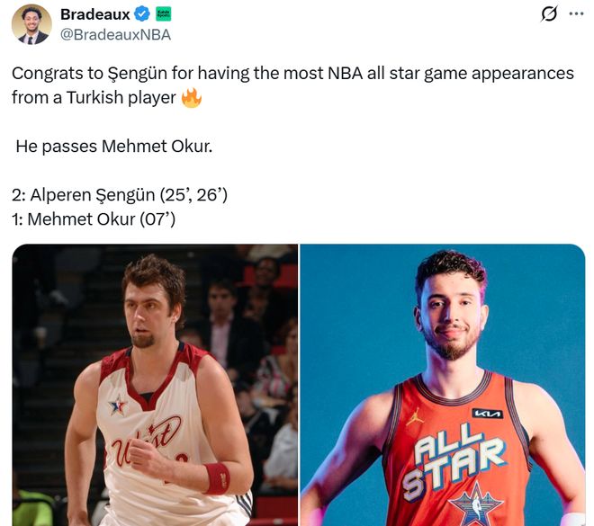 一口气狂刷4大纪录 纪录一:这是申京生涯第二次入选全明星,成功超过同胞奥库成为入选全明星次数最多的土耳其球员。