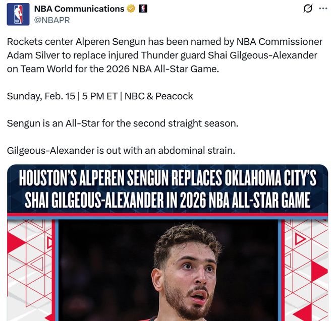 好消息:申京递补入全明星 由于亚历山大遭遇腹部肌肉拉伤,确认无法出战全明星,NBA总裁萧华指定申京入选全明星,后者将顶替亚历山大代表国际队参赛。 这一消息对于申京无疑是巨大的认可,他此前在落选之后,曾不止一次公开表示自己非常期待入选全明星,如果能够递补入选一定会出战。