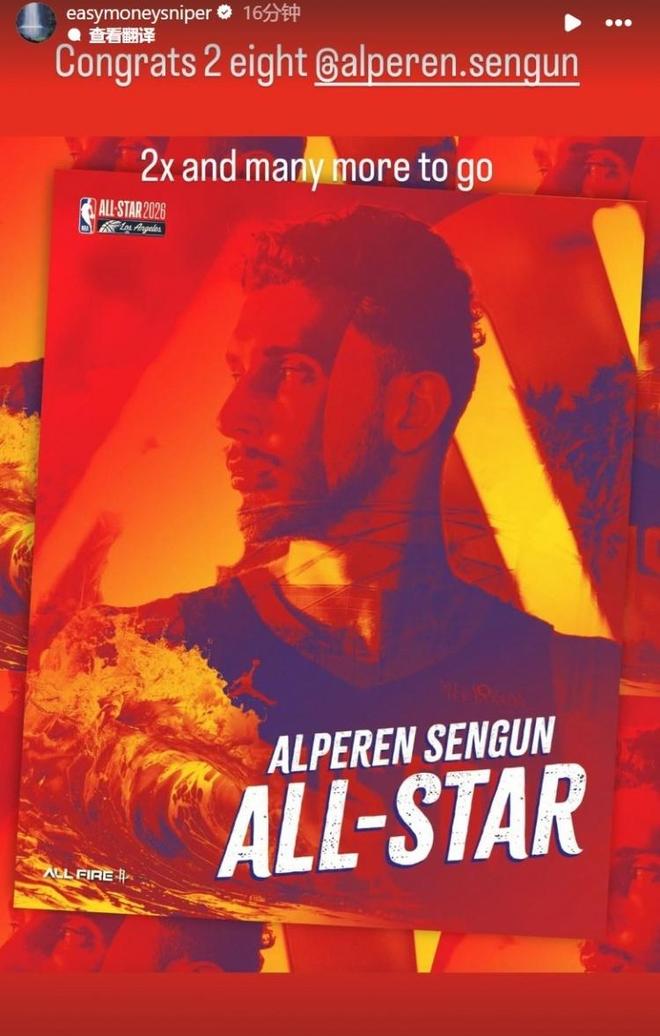 面对申京递补入选全明星,不仅是火箭队官方第一时间晒出海报庆祝,一同携手创造纪录的杜兰特也转发海报恭喜到:“祝贺28号,两次入选了,以后还会有更多。”