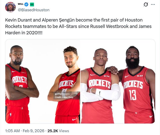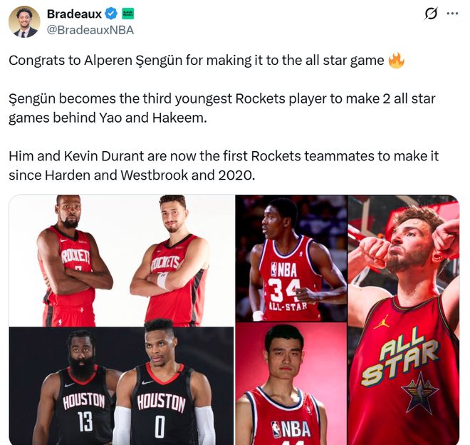 纪录四:加上此前杜兰特已经入选,让杜兰特与申京成为火箭队史自2020年哈登和威少以来首次同时入选全明星的队友。