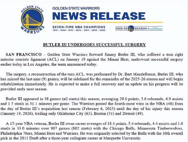 手术由伯特-曼德尔鲍姆医生主刀,对撕裂的ACL进行了重建。巴特勒已缺席过去9场比赛,将缺席2025-26赛季剩余所有比赛,并立即开始康复治疗。预计他将完全康复,下赛季初会提供最新恢复进展。 本赛季,巴特勒出战38场比赛(全部首发),场均在31.1分钟内得到20.0分、5.6个篮板、4.9次助攻和1.5次抢断。自上赛季(2025年2月7日)被勇士队交易得到,至本赛季受伤当日(2026年1月20日),勇士队以48胜的战绩位列NBA同期第四,仅落后于俄克拉荷马城雷霆(63胜)、波士顿凯尔特人(51胜)和底特律活塞(49胜)。 作为一名15年NBA老将,巴特勒职业生涯共出战907场比赛(802场首发),场均在33.0分钟内得到18.4分、5.4个篮板、4.4次助攻和1.6次抢断,曾效力于芝加哥公牛、明尼苏达森林狼、费城76人、迈阿密热火和金州勇士。他最初在2011年NBA选秀中被公牛队以第30顺位选中,此前在马奎特大学度过了三年大学生涯。 |