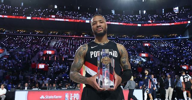 开拓者球星利拉德首轮轰下27分晋级决赛,之后又在决赛轮斩获29分,击败布克(27分)夺冠。