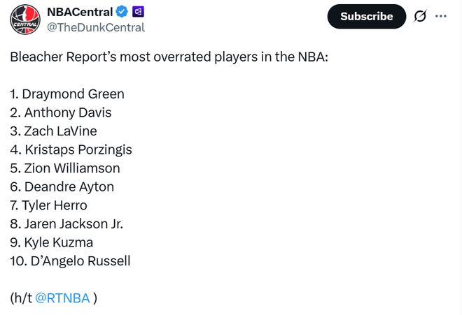在全明星周末短暂的休息期之中,美媒《RTNBA》结合本赛季上半程最新表现评选出现役最被高估球员TOP10名单,其中前五中勇士队独占两席,浓眉哥则高居第二。