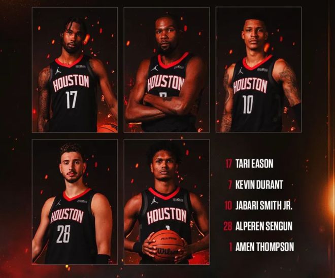 首发阵容方面,爵士队这边,首发五虎伤了四个,基扬特·乔治(脚踝)缺阵,凯斯勒(肩膀)、小贾伦·杰克逊(膝盖)和努尔基奇(鼻子手术)全部赛季报销,主帅排出的最新首发五人组为:马尔卡宁、菲利波夫斯基、科利尔、贝利、小文斯-威廉姆斯;火箭队这边,范弗利特和亚当斯赛季报销,首发阵容为:阿门-汤普森、贾巴里-史密斯、凯文-杜兰特、塔里-伊森、阿尔佩伦-申京。