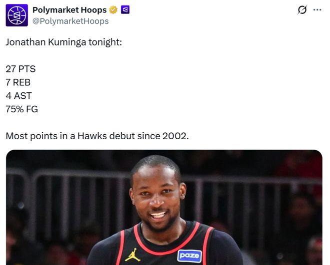 库明加破纪录 相比于特雷杨重回老东家的伤感,加盟新东家的库明加则是扬眉吐气,首秀就打破尘封24年之久的队史纪录。 库明加在交易截止日前通过一笔2换1交易加盟老鹰,勇士为得到波神,直接将库明加+希尔德打包送走。 受困于伤病问题,此前库明加一直没有出战,本场是其交易加盟老鹰后的首秀,结果这名此前一直被外界嫌弃球商不足的年轻锋线却打出惊艳表现强势回击。