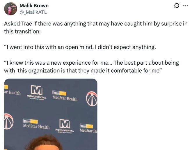 特雷杨潸然泪下 交易截止日前,老鹰队与奇才围绕特雷杨达成2换1交易,送出“鹰王”特雷杨仅换回和基斯珀特,价码可谓是廉价到了极致。 CJ-麦科勒姆 虽然本场比赛特雷杨因为膝伤无法出战,但依旧成为媒体关注的焦点,赛前也谈及对于这笔交易的看法。 特雷杨坦言:“我抱着开放的心态来到这里,没有抱任何期待,对于我来说这是一次全新的体验,加入这支球队很棒的点在于,他们让我感到很自在。”