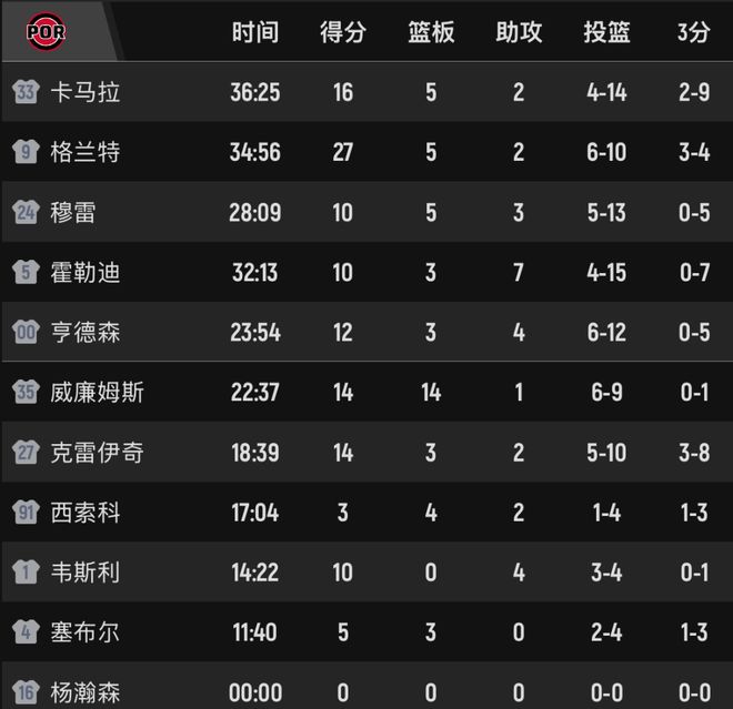 杨瀚森在前两节比赛中均未得到出场时间,两队在进攻端的表现都不错,开拓者半场69-63领先。罗威的出场顺位在小杨之前,他得到6分6板。第三节两队继续周旋,本节手感都不好,分差没有被拉开,开拓者一度领先11分,但又被缩小差距。三节战罢,开拓者93-86公牛。