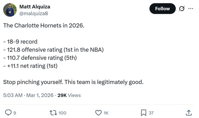 在本赛季开始前,没人能够想象这支黄蜂会交出如此亮眼的表现,因为他们已经连续9年无缘季后赛,是NBA目前遭遇季后赛荒时间最长的球队。 更让人绝望的是,在连续摆烂获得高顺位签的情况下,黄蜂队一直看走眼总是选不到靠谱的新星率领球队走出泥潭。 但本赛季黄蜂队扭转了这一局面,终于用4号签选中了建队基石克努佩尔,也让球队成功走出重建泥潭,继马刺、活塞、火箭等球队之后,成为联盟过去5年又一支通过出色选秀眼光结束重建的摆烂鱼腩,本场比赛中的3点更是证明这支鱼腩蜕变为黑马并非偶然。