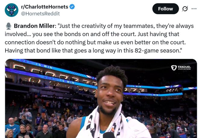 而防守的大幅提升往往得益于积极性与团队内部关系的改善,赛后布兰登-米勒也谈及这一点。 米勒赛后坦言身旁的队友都创造力十足,并且一直很投入,球员之间场上场下拥有这样的羁绊,只会让球队变得越来越强,在漫长的82场常规赛中,这样的凝聚力至关重要,是球队走得更远的底气所在。