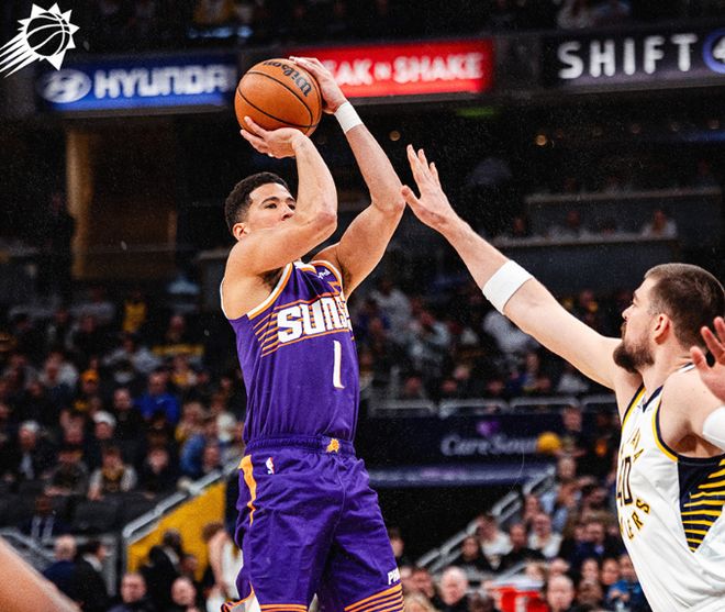 次节比赛,太阳连续两节单节得分30+,步行者被限制首次单节不足30分。双方缠斗至42-42,太阳连得4分,赫夫暴扣,太阳一波12-0攻势扩大14分优势。太阳之后维持65-52领先优势,步行者打出一波9-2攻势追分,太阳单节31-25净胜6分,上半场结束太阳67-61领先步行者。前两节比赛,太阳三分13中6,布克13中8得到22+4+3、格林14分与奥尼尔12分;步行者三分17中7,内姆哈德7中6得到23分与沃克10分、祖巴茨8分6篮板。 中场休息回来,双方第三节均是单节不足30分,布克第三节开启疯狂进攻模式,他单节12中5与不断造犯规罚球得分,一人单节狂轰19分,其余队友合计只得到10分。布克引领太阳单节29-27净胜2分,三节结束太阳96-88领先步行者。前三节比赛,太阳三分24中11,布克25中13狂轰41+7+4、格林19分与奥尼尔15分;步行者三分29中10,内姆哈德23分、祖巴茨8+6,引领3人得分上双。