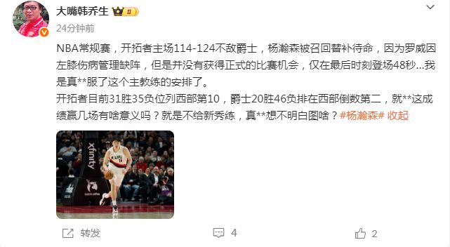 我们球迷的想法很朴素,既然开拓者没有KPI,斯普利特为何不大力起用培养锻炼杨瀚森,他可是首轮16号秀啊?