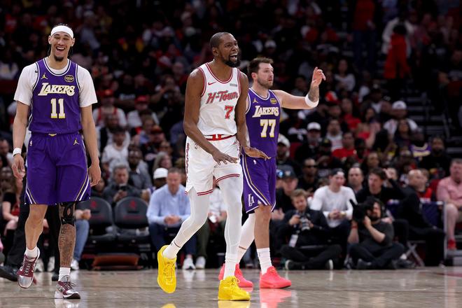 再擒火箭豪取7连胜,湖人一口气获4大喜讯!东契奇狂轰40+9+10破历史纪录,41岁“大王”詹姆斯仅丢一球完胜“小王”杜兰特。