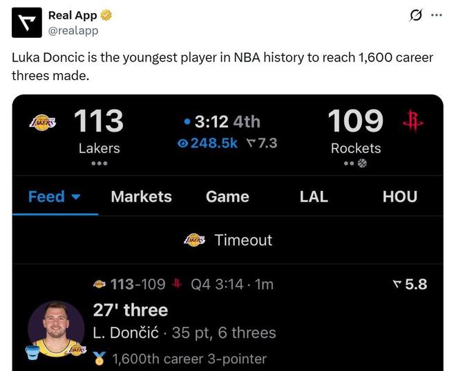 凭借这样的表现,27岁19天的东契奇迎来1600记三分里程碑,创造NBA历史最年轻纪录。
