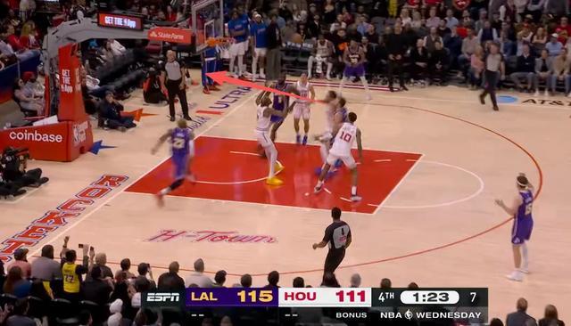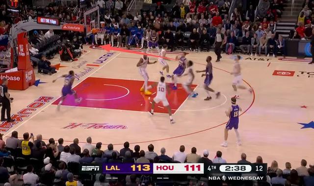 比赛进入到2分30秒左右,湖人113-111领先两分,东契奇随后在两个进攻回合都破掉火箭的夹击,突到罚球线位置吸引杜兰特的协防,然后给底角的队友送出空接扣篮。随后在第三个进攻回合对着小贾投进后撤步三分,一波7-0彻底终结了比赛悬念。