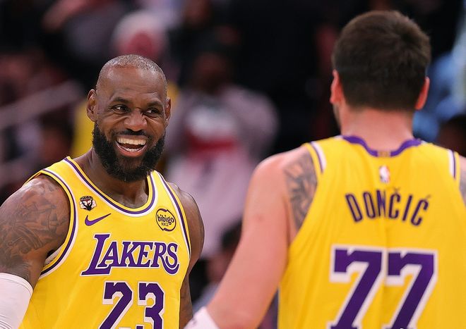面对83分先生阿德巴约,面对开局落后13分的被动局面,满分组合各司其职,联手导演大逆转!老詹出战37分钟,12投8中,罚球5中3,贡献19分+15篮板+10助攻的三双数据,高效完成终结,盘活全队进攻。东契奇出战37分钟,30投18中(三分球17中9),罚球19中15,爆砍60分+7篮板+3助攻+5抢断,关键时刻暴走连得16分杀死比赛。赛后,老詹一番话显然是说给83分先生听的:一切都是顺其自然,东契奇完全没有刻意争取60分。与此同时,满分组合一战刷爆多项NBA纪录。