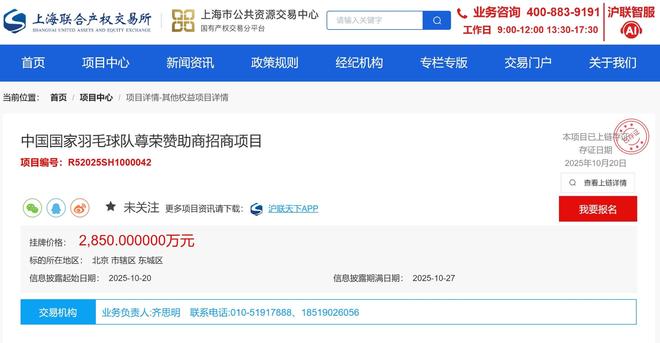 10月27日,据上海联合产权交易所官方消息,中国羽毛球队征集赞助商,三年合作挂牌价2850万元。