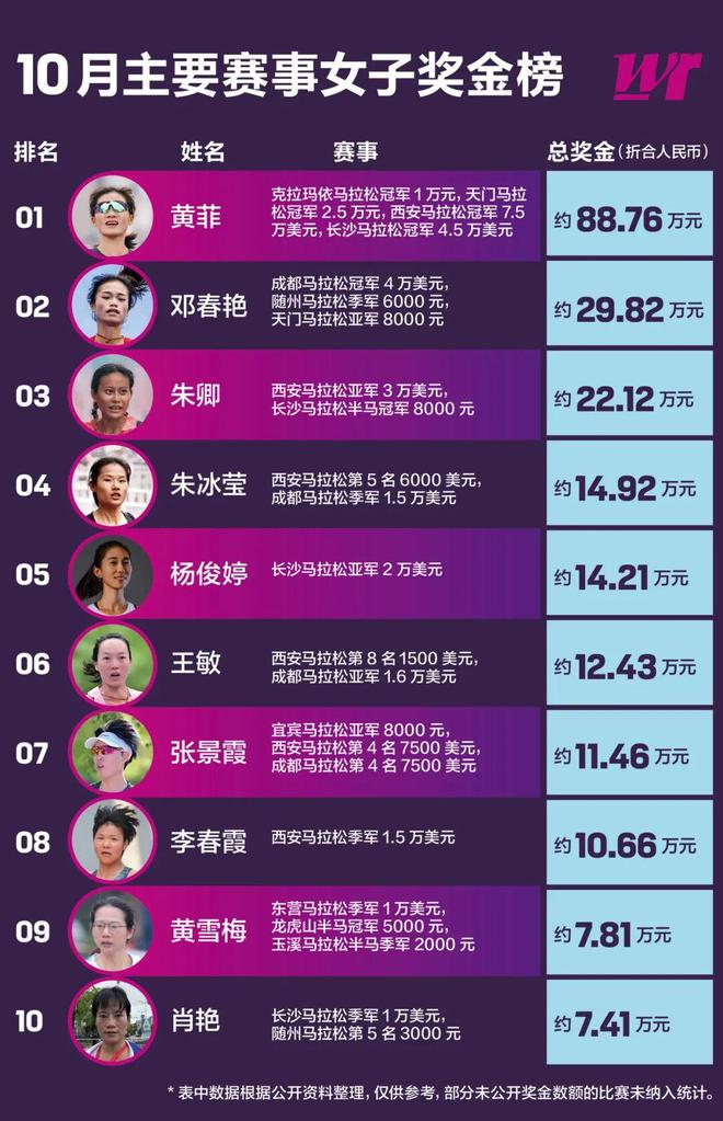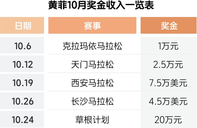 当然,在周末扎堆的比赛中,幸运的不只是黄菲,拿到今年成都马拉松女子冠军的邓春艳,继天门马拉松后继续PB,也顺势带走4万美元奖金,成为10月奖金榜第二名。