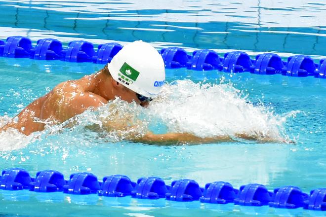 澳门泳手周文颢混合4x100游第二棒蛙泳接力,与队友一起把澳门纪录推快2秒05。 游泳赛事昨日产生两项澳门纪录,黄婉柔、周文颢、林志聪及陈佩琳合力出战4X100米混合泳接力项目,成绩4分05秒24,总成绩排第13位未能晋级,却成功把澳门纪录推快2秒05;吴致轩在男子100米自由泳预赛,成绩51秒43,也刷新澳门纪录,总成绩排第39位未能晋级;黄婉柔在女子50米仰泳游出31秒37,总成绩排第27位,同样未能晋级。 舞龙舞狮昨日进行最后一日赛事,由三地运动员组成的粤港澳联队及澳门队一同出战南狮传统项目,最后分别以9.19分及8.9分排名第2位和第6位,最终获颁二等奖和三等奖,并已完成该项目本届所有赛事。