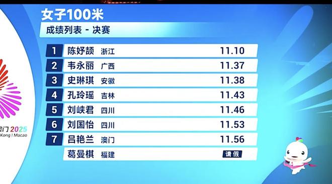 陈妤颉在两年前崛起,多次打破60米、100米和200米全国少年纪录、亚洲少年纪录。她被誉为最强中学生。陈妤颉今年的亚锦赛夺得了200米冠军,成为亚锦赛女子200米历史上最年轻的冠军选手。陈妤颉似乎在200米项目展现出更强的竞争力。 不过,在全运会赛场,陈妤颉这位天才少女,又带给了人们惊喜,在100米比赛她创造了神迹。陈妤颉预赛跑出11秒39,半决赛跑出11秒33。非常遗憾的是,梁小静因伤退出了100米比赛,连预赛都没参加。葛曼棋虽然跑了预赛和半决赛,但是因伤退出决赛。