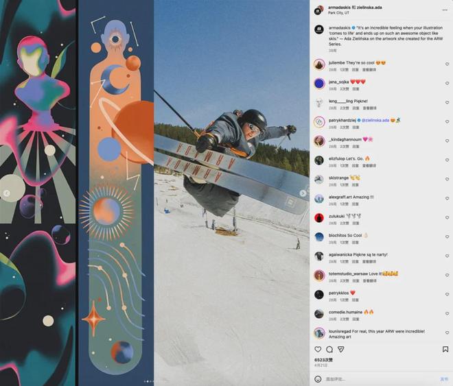 在社交媒体兴起后,消费者对“表达”和“拍片”有更强的需求:而滑雪不只是运动,而是一种个人呈现方式。 Armada 深刻理解这一点,因此在产品开发中大量吸收滑板、冲浪、街头艺术等元素,雪板图案更加大胆、色彩更年轻、品牌视觉更具文化张力。 在这一点上,Armada并非单纯地在制造产品,而是在打造了一种“基于滑雪的生活方式”。 当你走进雪场,拿着Armada的雪板,本质上是在告诉他人你属于哪一类滑者:你不是来比速度的,而是来挑战跳台、拍视频、体验雪山自由的。