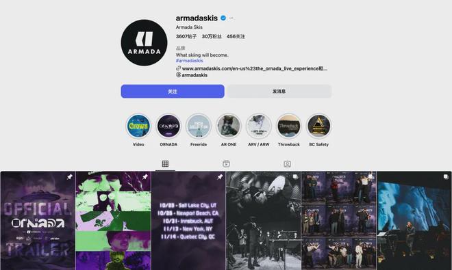 也正是在这种文化意义的推动下,Armada 即便定价高于中端品牌,仍堪称年轻滑手心中的“第一选择”。 从商业结构来看,这种定位也帮助 Armada 避开了传统巨头的主战场。 它不需要在“谁的技术指标更专业”上竞争,而是吸引那些更看重生活方式、内容表达、个性特征的滑手。这类用户黏性极强,复购周期稳定,同时高度依赖社交传播,对品牌而言是极具杠杆效应的客群。 二、Armada 的内容驱动式增长玩法 如果说好产品能让用户认同品牌,那么也只有好内容才能让他们愿意主动传播品牌。 而在滑雪这种具有高度视觉效果的运动里,品牌要想真正成为潜在客群的第一选择,就不能只依赖静态产品图或者专业赛事曝光,而是必须让内容变成一种生活方式的显性表达。 因此,Armada 的内容风格从一开始就非常明确——它拒绝那种传统户外品牌常见的“装备展示式拍摄”,转而采用更具街头气质、更原生的影像语言