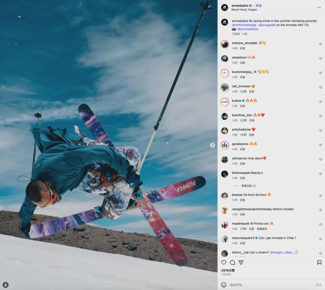 Instagram 上随处可见的,是滑手在跳台上腾空后扬起雪粉的瞬间、在栏杆上轻盈滑行的慢镜头,或是深雪里一头扎进粉雪的玩闹感。 尤其是那些看似随意的片段——雪后清晨的第一道滑痕、团队旅拍时路边即兴的动作——都呈现出一种更接近滑手真实生活的自然表达,让内容本身拥有极强的亲和力。 这种内容方式离不开滑手的参与,而 Armada 选择合作的滑手并不是“谁流量大用谁”,而是以“谁的风格最能定义品牌”为核心标准瑞典滑手 Henrik Harlaut就是其中最具代表性的例子。 他以夸张的服饰和极具能量的动作闻名,他的内容天然具有极强的分享性:跳跃的爆发力、落地时的速度感,甚至是他对镜头露出的招牌笑容,都能迅速吸引年轻用户停下来观看并转发。