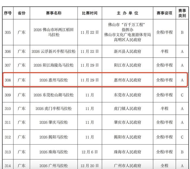 南都讯 记者李晓慧 近日,中国田径协会发布《关于公布2026年马拉松赛事目录的通知》(下称《目录》),对2026年计划举办赛事的名称、时间、主办单位、类别等信息进行公示。 《目录》显示,2026年全国预计举办492场马拉松赛事,设有全程马拉松和半程马拉松两个项目,A类赛事254场、B类赛事67场、C类赛事171场。广东将举办29场马拉松赛事,有17场A类赛事。惠州马拉松为A类赛事,暂定11月29日举行。