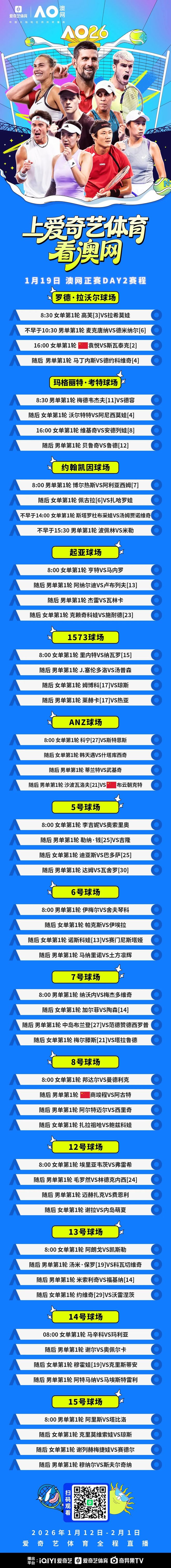 北京时间1月19日,2026澳大利亚网球公开赛第2日比赛将在墨尔本公园全面打响。直播间传送门——(手机/pad点击→阅读原文)。 爱奇艺体育将继续为您全程直播所有精彩对决!罗德·拉沃尔球场将上演两场焦点战:中国金花袁悦挑战世界第二斯瓦泰克,十冠王德约科维奇压轴登场迎战马丁内斯。