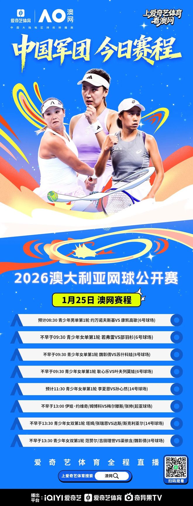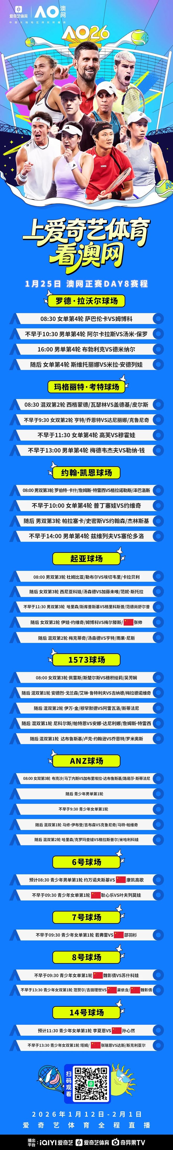 北京时间1月25日,2026澳大利亚网球公开赛第8比赛日将如期进行,爱奇艺体育将继续为您全程直播所有精彩对决。 男女单第4轮开战争8强!世界第一萨巴伦卡&阿尔卡拉斯在罗德拉沃尔球场早场先后登场,本土球星德米纳尔和“小米辣”安德列娃坐镇晚场。高芙迎战强敌穆霍娃,梅德韦杰夫遭遇老对手勒纳·钱,兹维列夫与F.塞伦多洛也将上演强强对决!中国金花张帅女双次轮的比赛将在起亚球场登场,请您不要错过。