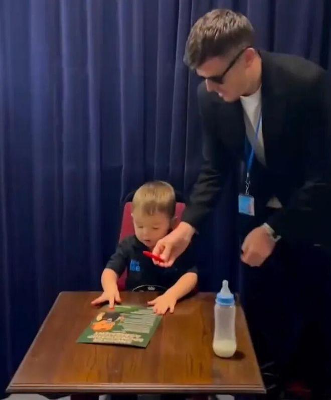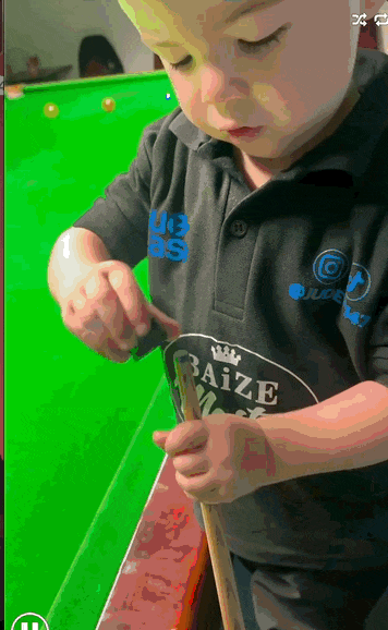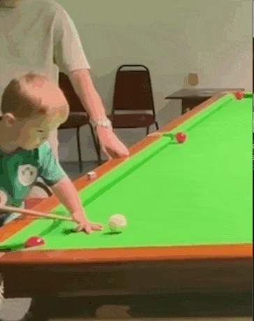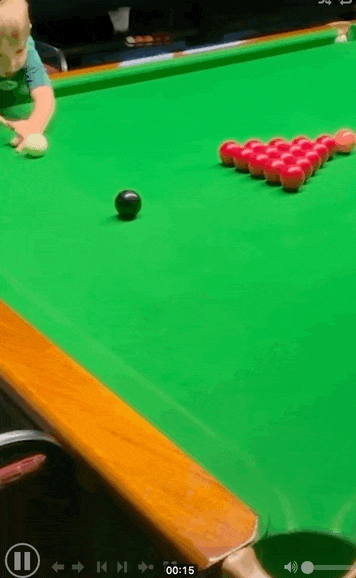 (欧文斯要爬上凳子才能打到球) 于是在两代人都被天赋“卡脖子”后,欧文斯在2022年12月出生了。卢克自然想尝试发掘一下,看看他有没有这方面的天赋。 在欧文斯两岁的时候,父亲卢克先给他买了个迷你台球桌,但没过多久,他便开始尝试玩斯诺克标准台了。 画面很诡异,孩子甚至没斯诺克球台高,只能爬凳子上玩;结果他手上功夫甚至要令不少成年人汗颜。 最奇特的是,没人教他怎么架杆,可他第一次拿起球杆,就很自然地把球杆穿过手指架起了“手桥”,让父亲卢克非常惊讶。 两岁半的时候,他完成了第一次击球,从此开始经常练习打球,虽然暂时还不能把斯诺克玩得很溜,但花式台球已经玩出了一些心得。