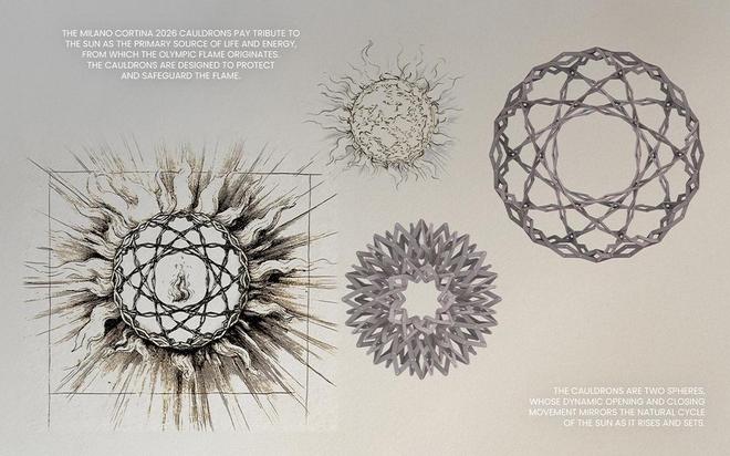 主火炬台:共两座,灵感来自达·芬奇的手稿 1 月 20 日,本届冬奥会组委会正式揭晓了主火炬台的设计。 它的外观从意大利文艺复兴巨匠莱昂纳多·达·芬奇绘制的几何绳结手稿中汲取了灵感,呈现复杂又和谐的几何外观,它也很像很多小朋友都玩过的霍伯曼球,采用了可开合的动态结构设计,闭合状态下直径为 3.1 米,开启到最大状态则有 4.5 米。