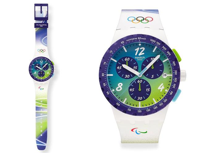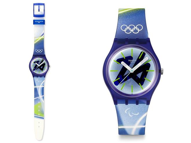 装备的外观设计主要调用了本届冬奥会的视觉形象方案,蓝色加青绿色的配色思路,写意富有律动的抽象纹样,彰显本届冬奥会特色的同时,整体也颇有设计感。 Swatch 推出两款冬奥主题腕表 Swatch 斯沃琪在去年 12 月推出了两款冬奥主题腕表,它们都采用了冬奥会官方配色,但也分别有各自的特色。 其中 CHASING PEAKS(巅峰之战)的表壳直径为 34 毫米,腕表整体以蓝色调呈现,点缀以鲜艳的绿色,设计上融入了类似玻璃结霜的视觉效果,和冬奥会会徽的设计思路一脉相承,这款腕表的表盘上也装饰了巨大的会徽图案。