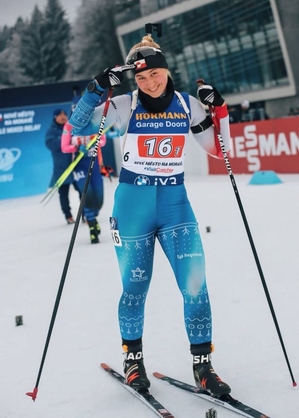 滑雪装备采用蓝白色,在冰雪背景下显得格外清爽。