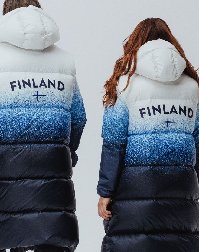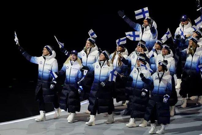 芬兰 芬兰队的羽绒服由本土品牌 Luhta 打造,设计灵感直接取自拉普兰,宁静且神秘。配色上采用了从纯白到深蓝的自然渐变,仿佛从雪地过渡到深邃的极夜。