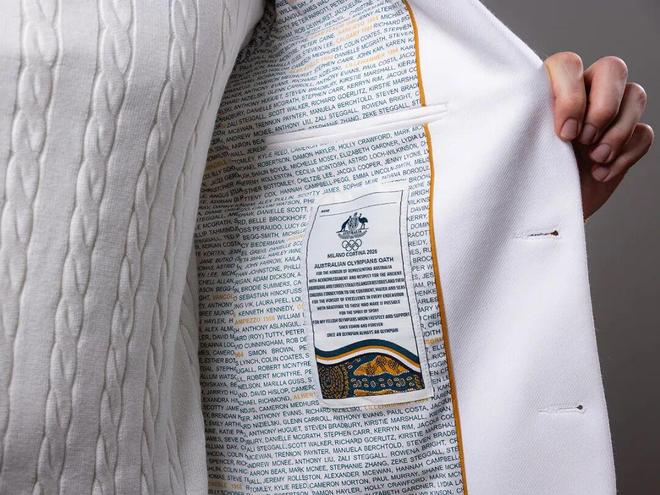 设计师在西装内衬里密密麻麻地绣上了自 1936 年以来,所有 260 多位澳洲冬奥运动员的名字,还印上了的奥运宣言,特别有传承感。