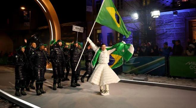 Moncler给巴西旗手设计的羽绒服也火了,旗手直接把外套当成斗篷一样展开,瞬间露出蓝绿金的巴西国旗内衬,视觉冲击超强。