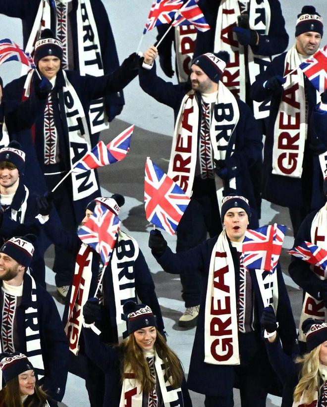 03 最炫民族风 文化叙事有温度 在冬奥会这样的大型国际舞台上,服装早已超越了单纯的御寒功能,各国不仅在比拼竞技实力,更是在借由“战袍”向世界展示民族底蕴与文化自信。 英国 英国队这次依旧与本土品牌Ben Sherman合作,英伦基因纯正。