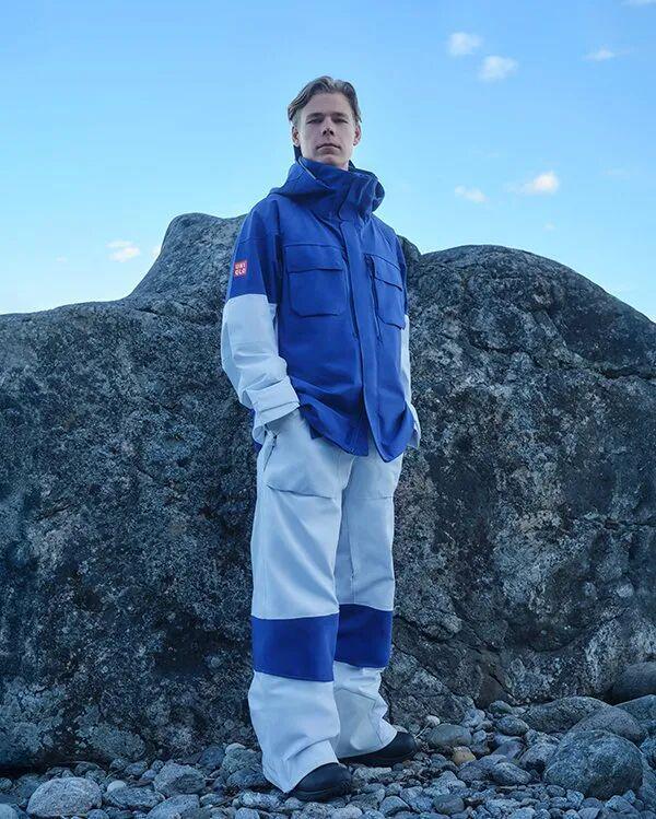 滑雪服倒是有种梦幻的诗意,深浅不一的蓝色渐变从上至下蔓延,营造出一种极光掠过夜空的视觉效果。细节处点缀了传统的因纽特图案,文化元素的融入非常加分。