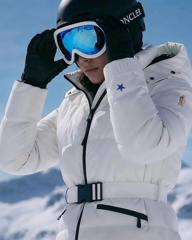 女运动员穿的绗缝羽绒款式,视觉上也极具机能美感。细节处点缀星星装饰,勾勒出一种动感十足的速度感。