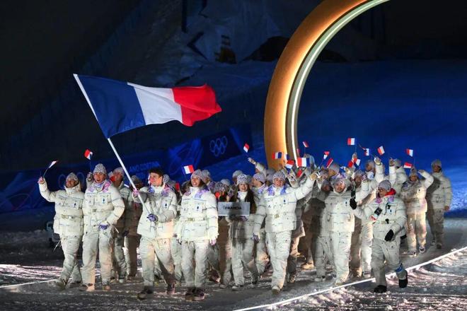 闭幕式的造型则转向了动感十足的拼色羽绒裤,红白蓝象征国旗颜色,搭配羊毛高领衫和白色运动裤,诠释一种复古美学。