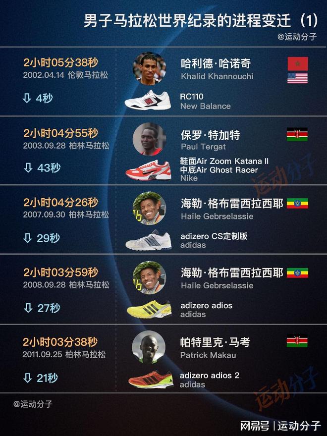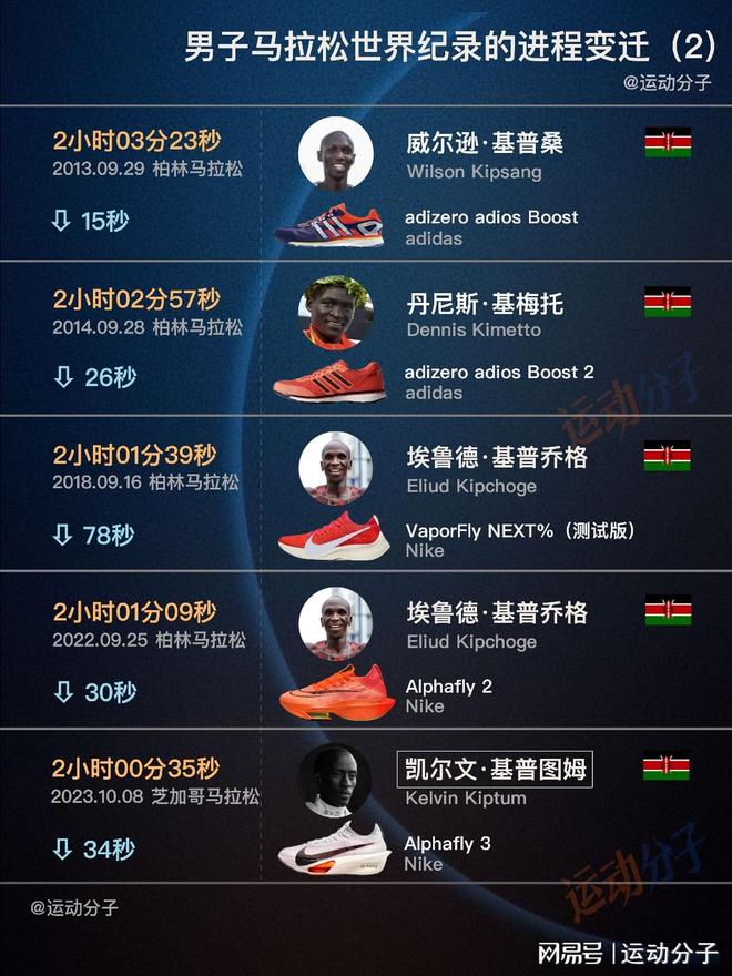 ♂️ 哈利德·哈诺奇是摩洛哥裔长跑好手,99年在芝加哥跑出过世界最快。而后入籍美国,02年伦敦再次刷新时,身份已变成美国选手; 保罗·特加特与海勒·格布雷西拉西耶堪称一生之敌,两人职业生涯从各种距离的场地径赛、越野到路跑,又各自创造了马拉松世界纪录。特加特打开205大关,而“长跑皇帝”老格则连续两年刷新纪录; 过往历史中,伦敦、鹿特丹、芝加哥等都是知名的快车道,但最终的王者是柏林,男子9个世界纪录,8个都在此诞生。 柏林对应的关键词,还有肯尼亚军团、adidas的adios系列等,帕特里克·马考、威尔逊·基普桑、丹尼斯·基梅托,他们一步步推进着耐力的极限。 十二年转瞬一轮,纪录缩短超过160秒; 再往后就是埃鲁德·基普乔格和超级碳板跑鞋时代,即便已经32岁,当时很多人依然认为基普乔格刷新纪录是迟早的事,更大胆点已预测他能够正赛破二。 2018年的柏林,基普乔格穿着Vaporfly NEXT%测试版,摧枯拉朽的把纪录往前整整提升了78秒。这是自1967 年德里克·克莱顿以来,进步幅度最大的一次。 四年后,37岁高龄的基普乔格再次创造神迹——前半程只用59 分 51 秒,甚至比19年159挑战时更快(那场最终1小时59分40秒完成)。后半程尽管配速略有下降,依然遥遥领先纪录,2小时01分09秒,平均配速2分53; 基普乔格未能完成的正赛破二,冥冥中长跑之神很快选出了接棒者,又偏偏很戏谑的并未给予太多时间——凯尔文·基普图姆的人生仿佛流星,生涯仅三场马拉松,全跑进202+夺冠,唯一一位跑进201的人类。 2023年的芝加哥,2小时00分35秒惊为天人,更惊艳是他以负配速完成,后半程比前半程快了61秒,在最为艰苦的30-40公里,他均速2分51…… 原本基普图姆计划2024年4月鹿特丹马拉松实现破二,可惜2月遭遇车祸,人生停留在24岁。马拉松破二不会是人类禁区,只是最可能实现的人先行离开了。