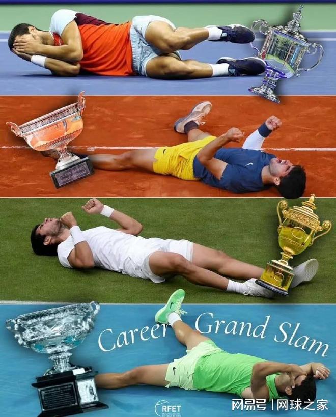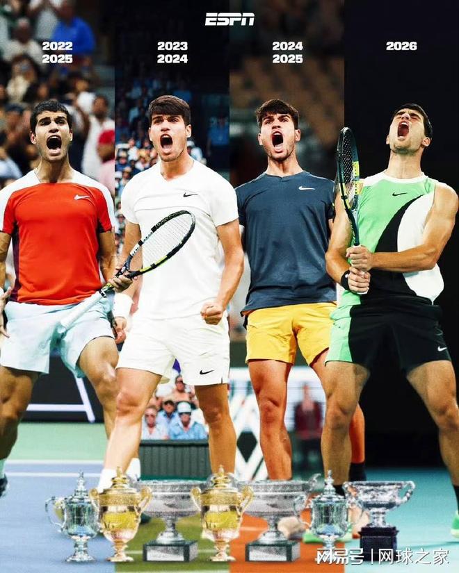 2003年温网,首次闯进大满贯决赛的费德勒,最终击败澳洲大炮菲利普西斯,问鼎个人首个大满贯冠军。 2004年,他又依次拿下了除法网外的三大满贯,使得个人大满贯数量增加积少成多。在此期间,他丢掉的大满贯冠军数寥寥。除了法网外,他还在2005年的百年澳网半决赛中不敌萨芬。 阿尔卡拉斯: 3年4个月(2022美网-2026澳网) 阿卡达成七满贯的时间,仅仅多于费德勒,要短于德纳两大巨头。阿卡首次登顶是在2022年美网,当时在一场谁赢谁就是世界第一的对决中,阿卡击败鲁德,最终问鼎。